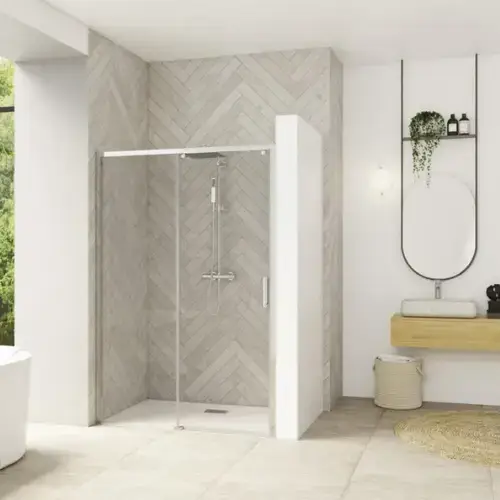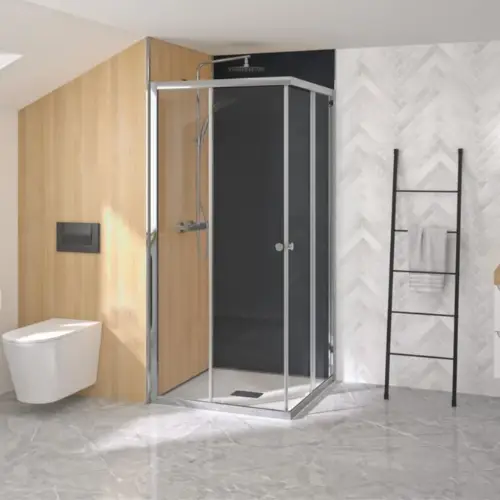 Paroi, ouverture coulissante, accès d’angle, 80×80, profilé chromé, verre transparent – SUPRA A (KINEDO)