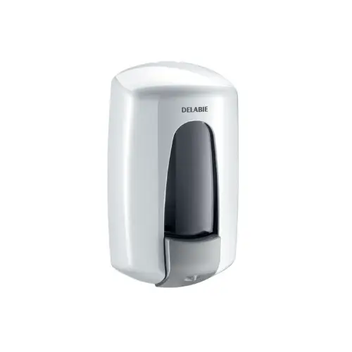 Distributeur de savon liquide mural, réservoir intégré, corps et poussoir en ABS anti-choc, réservoir de 0,9 litres, ABS blanc – DELABIE